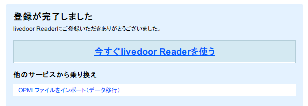 登録が完了すると次のようなページに移動するので「OPMLファイルをインポート(データ移行)」というところから進んでください。