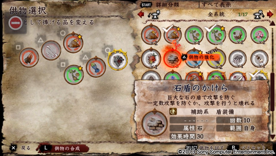そして0回まで使い切ってしまうと「リブロムの涙(クエストをこなすと貰える)」で修復が必要になります。使い切るとそのクエスト中はその魔法は使えなくなるので出来ればコンスタントに供物を補充しながら戦いたいところです。