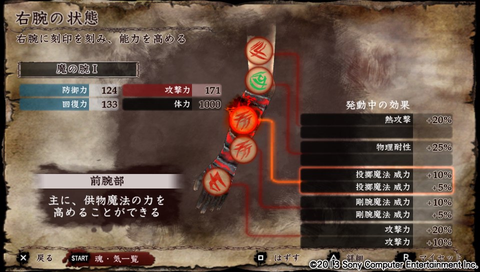 また、右腕には刻印を施しエンチャントのような形で能力を上げることができます。これも救済と生贄それぞれの方向性でだいぶ変わってきます。