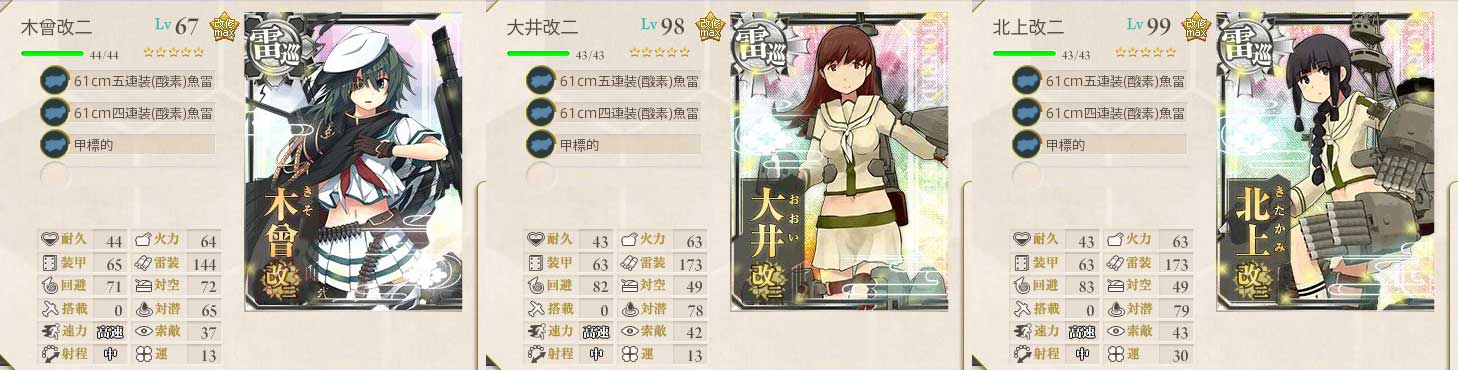 実際の運用ではどうかというとレベル差の影響もあるとは思いますが雷撃のパンチ力が今ひとつです。また3隻で開幕雷撃すると標的が結構被ってしまうのと、その後の砲撃戦では大井北上同様にあまり戦果が見込めません。